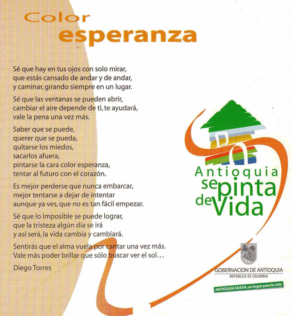 Concebir proyectos y programas sociales que produzcan bienestar material y fortalezcan del tejido social de la comunidad con el mejoramiento del espíritu y del sentido estético, es una tarea ardua y por eso debemos rescatar el denominado programa Antioquia se pinta de Vida desarrollado por la Gobernación de Antioquia en el año 2005.