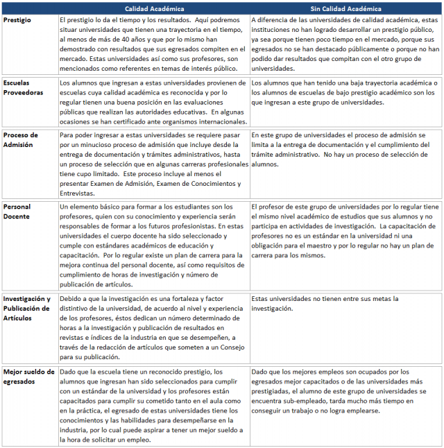 Buscando una tipología de corte más pragmático, podemos encontrar un paralelo entre universidades con calidad y sin calidad académica, de una forma sencilla, como la que realizo la especialista en mercadeo Karina López, en http://marketingeducativo.mx/, donde en un análisis de la realidad mexicana encuentra seis características básicas para diferenciar las universidades de calidad: Prestigio, escuelas proveedoras, procesos de selección, personal docente, investigación y publicación de artículos y mejores sueldos de los egresados; que como raseros generales pueden ser fácilmente leídas y manejadas por los estudiantes y en especial por los padres de familia para ese proceso de seleccionar una universidad. Y por ello, reproducimos la siguiente matriz: