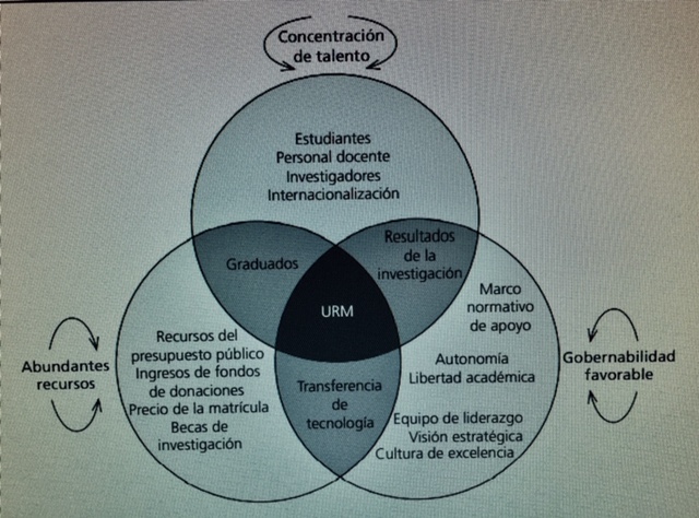 El propio Jamil Salmi, reconoce que el termino “universidad de rango mundial” se ha convertido “en frase de moda”,(literalmente, lo menciona dos veces) y vaya que si es cierto!. Y algo peor puede ocurrir que sea un eslogan o lema de publicidad institucional. Y no es necesario ir hasta la pasta final del libro; para caracterizar las universidades de rango mundial(URM), basta recurrir a la gráfica adjunta que ha sido tomada del texto, para ver esas características especificas de tal categoría de universidad; que se resumen en tres grupos: