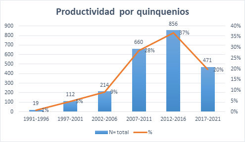 Figura 1. Productividad por periodos durante los años 1991 a 2021 en Web of Science