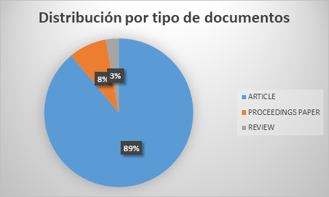 Con respecto al tipo de fuentes en donde más se publica los avances científicos en Administración Pública (ver figura 3), se destaca los artículos como el principal mecanismo de difusión de los resultados de investigación con un 89%, seguido por un 8% que se hace a través de artículos de revisión (estados del arte) y un 3% por medio de actas de conferencia.
