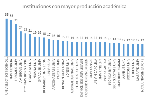 El análisis de la productividad por instituciones (ver figura 2) comparado con el número de citas (ver tabla 3), sugiere la idea de que no necesariamente aquellas instituciones más productivas corresponden con las que mayor impacto tienen. Si bien la “University of Electronic Science and Technology of China” es la más productiva, solo posee un artículo dentro de los 30 más citados. A diferencia de la Universidad de Siracusa que ocupa el octavo lugar en productividad con 19 artículos publicados, pero registra 3 papers en la lista de los más influyentes en administración pública.
