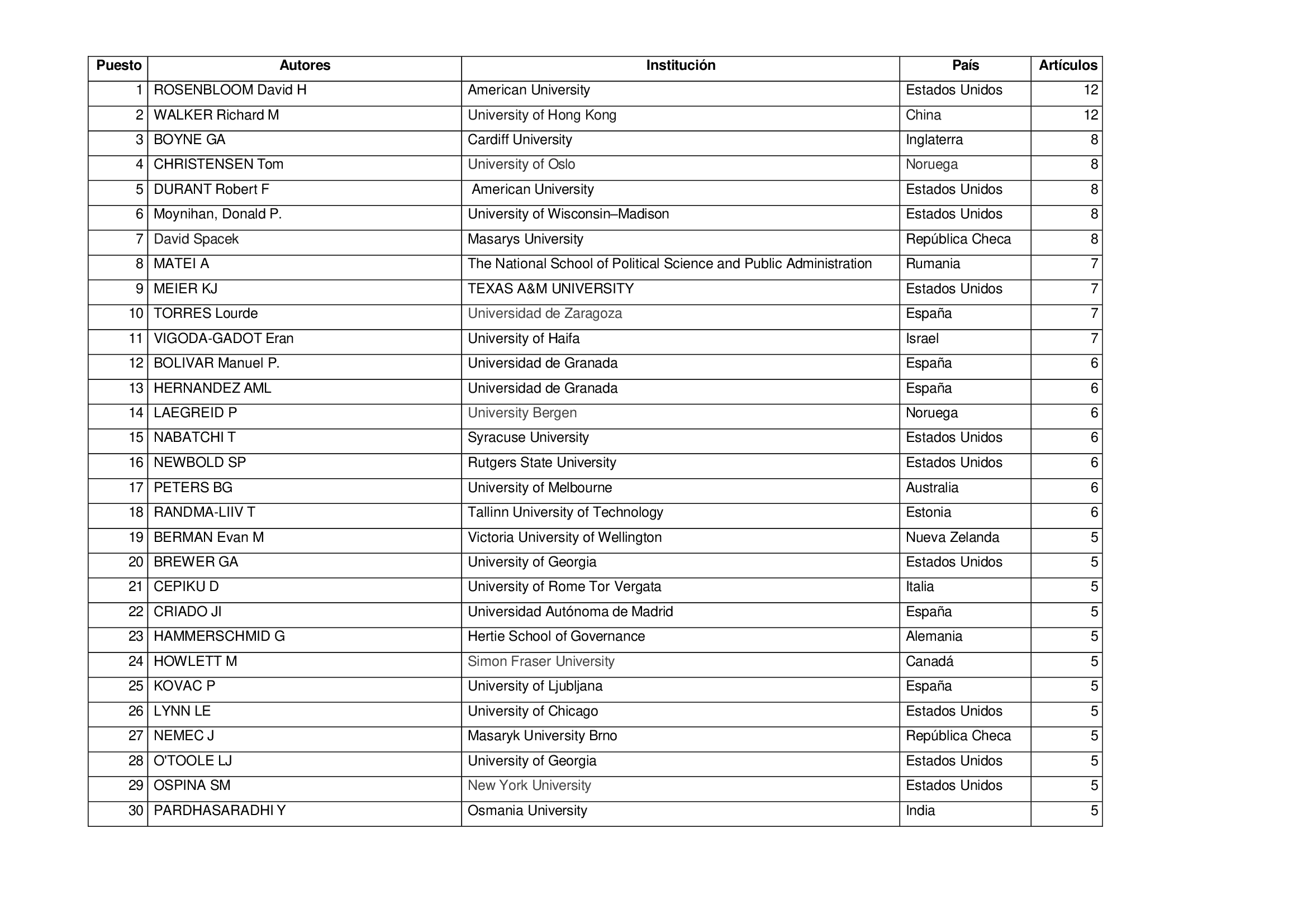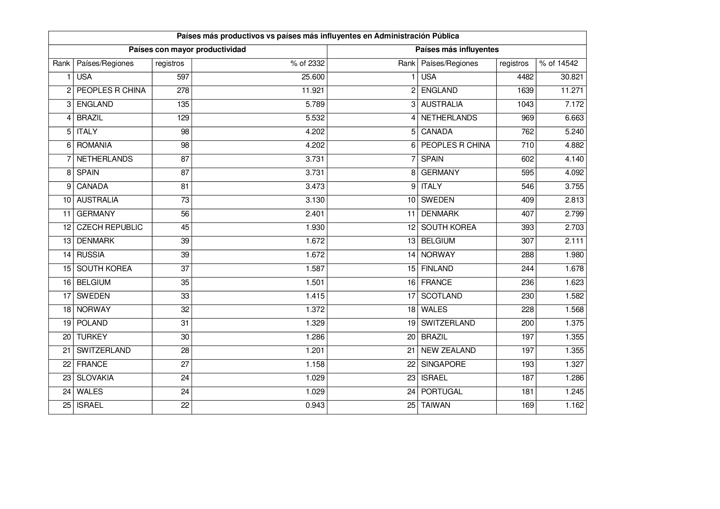Al comparar las revistas más productivas sobre Administración Pública con las más influyentes (más citadas), se observa que la Public Administration Review ocupa el primer lugar en este último indicador con 7.651 citas y un factor de impacto de 4,591, lo cual confirma no solo su cualidad de ser la más productiva sino también la más influyente dentro de su área temática. También se advierte que en las primeras cinco revistas más influyentes no se encuentran ninguna de las cuatro publicaciones más productivas que le sigue a esta última, lo cual refuerza la tesis de que las revistas más productivas no siempre son las más citadas.
