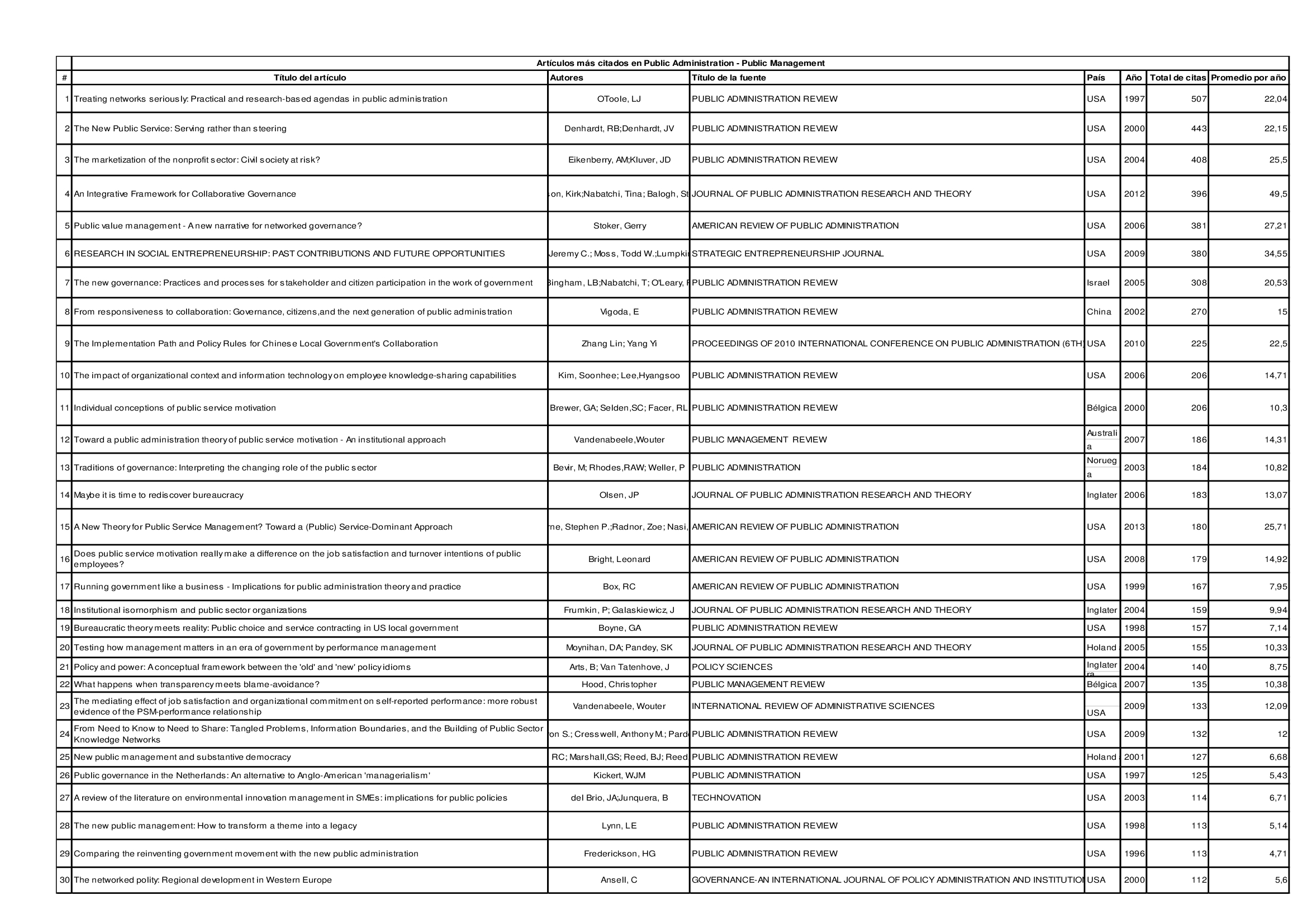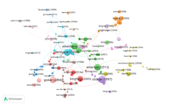 Así las cosas, el gráfico anterior no solo corrobora los datos de la tabla 3,(ver abajo) en donde O’toole (1997), Denhardt (2000), Eikenberry (2004), Emerson (2012) y Stoker (2006) ocupan los primeros cinco puestos en los artículos más citados en administración pública, sino también muestra las redes de artículos que se forman alrededor de estas influyentes publicaciones.