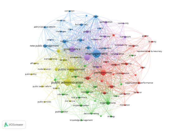 Luego de hacer un recorrido por las revistas, autores, instituciones y países más productivos e influyentes sobre administración pública, se llevó a cabo un análisis complementario de los resultados obtenidos, utilizando una herramienta que genera gráficos (mapas) a partir de información bibliográfica, denominada VOSviwer. VOSviwer es un software diseñado para construir y visualizar redes o (clúster bibliográficos). Estas redes incluyen redes de revistas, autores o artículos, las cuales se pueden construir a partir de citaciones, coautoría y clúster o conglomerados bibliográficos basados en la similitud de referencias bibliográficas. Esta herramienta también incorpora funciones de minería de textos que pueden utilizarse para construir y visualizar redes de co-ocurrencia de términos relevantes extraídos del cuerpo de artículos científicos (Eck & Waltman, 2019).