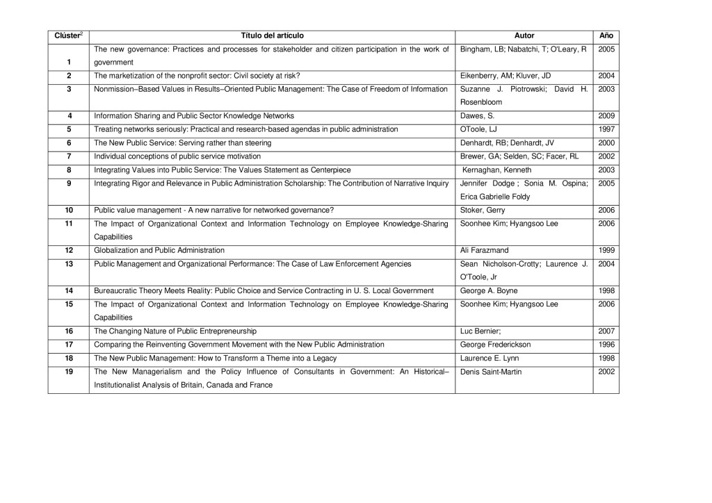 El análisis de los 19 clúster de Administración Pública en conjunto con los artículos que los encabezan, podrían arrojar mayores luces sobre los temas y autores que son referentes en ciertas líneas de investigación dentro de esta área del conocimiento. Los artículos que lideran los 19 clúster (ver tabla 5) de dicho mapa, lo que representa los ejes temáticos sobre los cuales se están desarrollando las nuevas perspectivas de la administración pública en la actualidad.