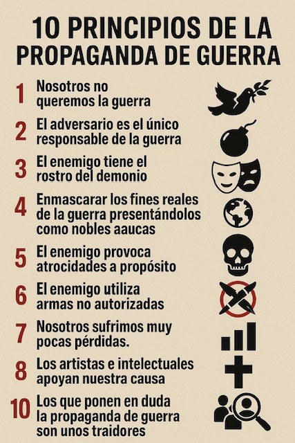 Hasta aquí los 10 principios de la propaganda de la guerra, de A. Morelli y que con fines pedagógicos hemos resumido, acogiendo la propuesta de ella de tomar por base el libro de Lord Arthur Ponsonby ( 1871-1949)Falsedad en tiempos de guerra, editado por Allen and Unwin, Londres, 1928; año coincidente con la publicación del libro de Edward Bernays Propaganda. Horage liveright,New york,1928.